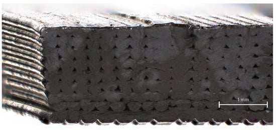 Figure 13 shows a microscope image of a printed CDP material sample that was taken with a confocal laser scanning microscope. We can clearly observe the layered structure of the sample and the parallel-aligned, straight strands that originate from the extrusion from the 3D printer. Because the 3D-printed samples all have this structure, we expect that the material samples should exhibit anisotropic properties to some degree. For example, if the electric field is oriented parallel to the strands, we expect the permittivity to be slightly different than if the field was perpendicular to them. Moreover, the air pockets between the strands will further affect the permittivity. The same sample is shown with a much larger magnification in the SEM images of Figure 14.