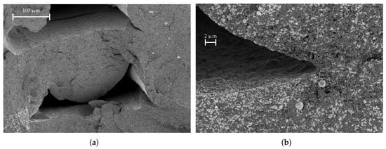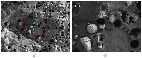 Figure 16 shows a SEM image of a FEP filament material sample. Again, the area marked in red is shown enlarged in Figure 16b. The FEP material is PLA, which is loaded with iron powder; the PLA matrix can be clearly visible, some of which are highlighted by arrows in Figure 16b. The dark, almost black round structures are small holes that originate from iron powder grains that were ripped off when the sample was prepared. Apparently, the grains are around 5 m to 30 m in size. As mentioned before, the individual grains are isolated in the matrix and do not touch each other; therefore, the material does not have a DC conductivity and its losses are lower.