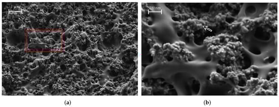 SEM images of a FEP material sample. The arrows indicate iron grains. The area marked in red is shown enlarged on the right. (a) FEP, medium magnification; (b) FEP, large magnification.