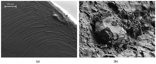The fracture surfaces of the KIM material are especially interesting. Figure 18 shows a SEM image thereof. In contrast to all other materials we have seen so far, the fracture surfaces are extremely smooth. Otherwise, we could not identify any filler materials. Further, there are only very few inclusions, the material or origin of which we cannot identify; one example is shown in Figure 18b.