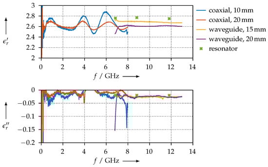 For materials having high losses, such as CDP (refer to Figure 25), SSP (refer to Figure 23), or FEP (Figure 21 and Figure 22, respectively), the perturbation of the resonator is large enough such that the assumptions of the perturbation method are no longer valid, even though we used small material samples only. This is the reason why we observe only poor agreement of the permittivity measured with the resonator vs. measured with the transmission/reflection method for these materials.