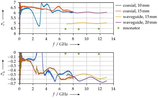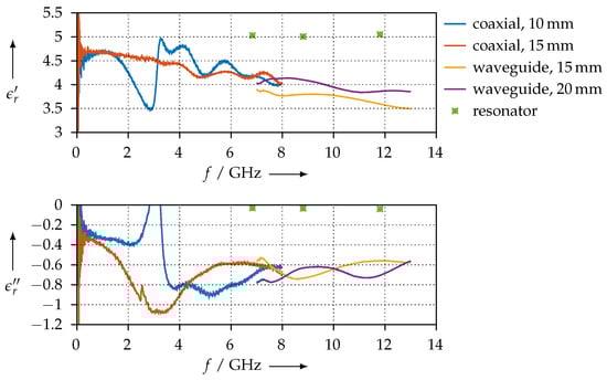 The permittivity that we calculated for the PLA sample is shown in Figure 20 for both the coaxial and the waveguide measurements of all different length samples that we made. The permittivity value we found is in good accordance with other publications [28,29,30]. Moreover, we have good agreement between the resonator and the transmission/reflection measurements.