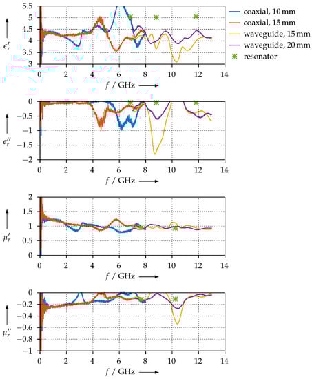 Table 4 shows the real and imaginary parts of the permittivity and permeability we measured for all samples. Note that we performed the measurement of the empty resonator before each actual MUT measurement. For better clarity, we omitted these “empty” measurements in Table 4, showing only the MUT measurements.