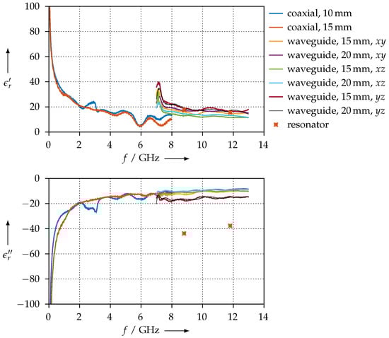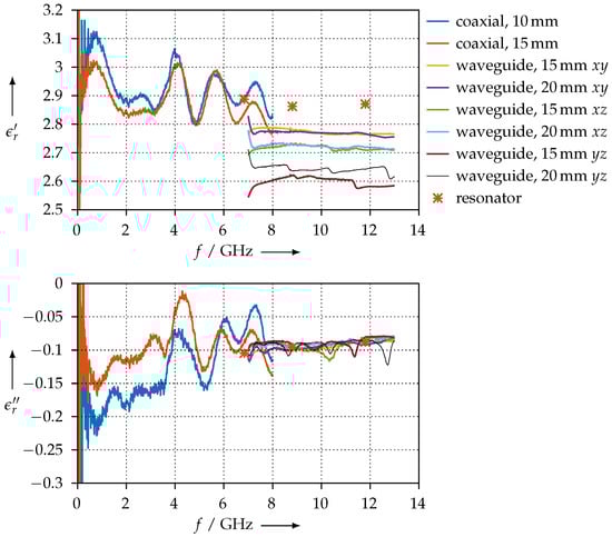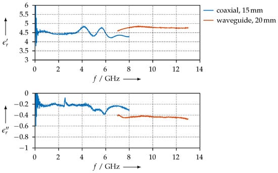 Figure 21 shows the resulting permittivity when we assume . As one can see, the coaxial and waveguide measurements agree very well (between 7 GHz and 8 GHz). However, we can observe a large ripple for the 10-mm coaxial sample that is most likely related to the network analyser calibration, where we have used the port extension feature.