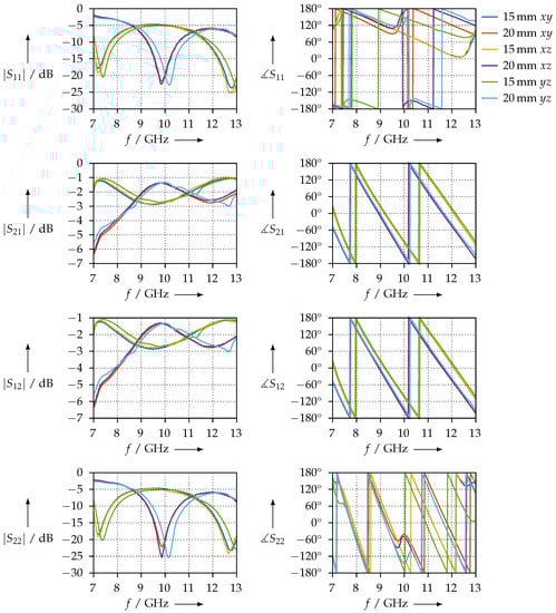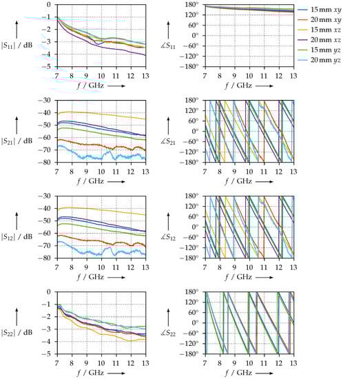 In contrast, Figure 28 shows the same measurements for the CDP samples. We observe that the condition is not met for all samples; this is an indicator that the printing process was not homogeneous. Reasons for this could be an unbalanced distribution of the carbon powder in the filament or irregularities resulting from 3D printing. However, the condition is met. The phase slopes of or are almost identical, which leads us to the assumption that the real parts of the permittivity should be nearly identical as well. To verify whether the inconsistent and are not measurement artefacts but indeed a property of the sample being measured, we exchanged the waveguide ports, i.e., connected port 2 where port 1 was, and vice versa. We found that we obtained the same results, but with and (and, of course, and ) interchanged; therefore, we can conclude that this is actually a property of the sample.