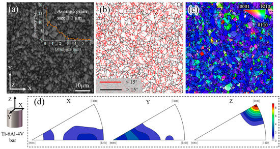 The as-received commercial Ti-6Al-4V alloy (From Shanghai Yingxiong Metal Material Co., Ltd., Shanghai, China) was a hot-drawn bar, with a chemical composition (in wt%) of 6Al-3.9V-0.15O-0.008H-0.02C-0.03N-0.12Fe. According to the characterization results obtained using electron back-scattered diffraction (EBSD), a near-equiaxed grain structure with an average grain size of 1.1 μm and 78.8% low-angle grain boundaries (LAGBs) in the Ti-6Al-4V billet was observed, as shown in Figure 1a,b. The LAGBs indicate that the billet had high storage energy, favoring recrystallization nucleation. The inverse pole figures in Figure 1c,d show a strong texture component of <-1100> parallel to the bar Z-direction owing to the drawing characteristics. Ti-6Al-4V is a two-phase (α + β) alloy composed of about 95% α phase at room temperature. The α grains in the initial, room temperature Ti-6Al-4V alloy, transform into β grains, which then grow quickly above the β transformation temperature of around 975 °C [27].