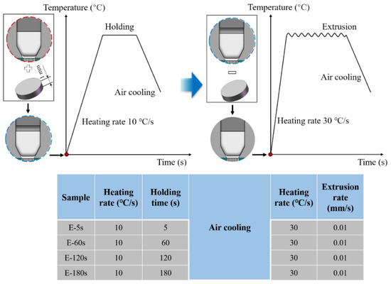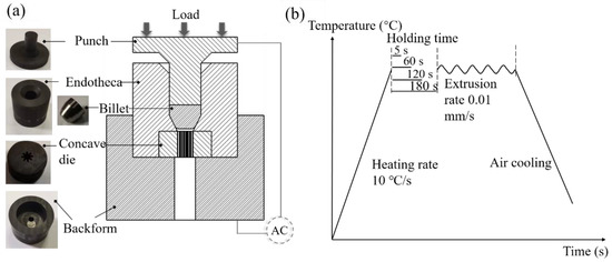 Figure 2a shows the extrusion diagram and graphite molds, including punch, endotheca, concave die, and backform. Figure 2b displays the extrusion process. The molds and billet were heated to the extrusion temperature of 1200 °C in a vacuum chamber using a Gleeble-1500D thermal-mechanical simulator at a heating rate of 10 °C/s and were then held for 5 s, 60 s, 120 s, or 180 s under a steady clamping force of 30 Kgf. Then, the billets were extruded at a rate of 0.01 mm/s, followed by air cooling. The corresponding parameters are listed in Table 2.
