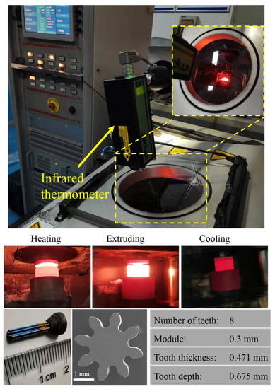 Micro-gears are pivotal actuating elements in the transmission of power and motion and are used extensively in microelectromechanical systems (MEMS), including medical treatment, aviation, automobile, communication, and military applications [1]. Some forming methods and materials of micro-gears are listed in Table 1. It has been shown that extrusion is the most advantageous of these methods due to its high efficiency, high-volume throughput, and low unit cost. Titanium (Ti) alloys have excellent properties, such as low densities, excellent corrosion resistance, high strength-to-weight ratios, excellent fatigue performance, and biocompatibility [2]. Li et al. [3] simulated the hot extrusion of Ti–6Al–4V alloy and the results were compared with those obtained experimentally. Ye et al. [4] investigated the dynamic recrystallization and strengthening-toughening effects in a near-α Ti-xSi alloy processed by hot extrusion. Yang et al. [5] studied the microstructure evolution and mechanical properties of P/M Ti-22Al-25Nb alloy during hot extrusion. Currently, there is much research on the macro-extrusion of titanium alloys, while there is little literature on the extrusion formation of micro-gears using difficult-to-deform Ti alloys, due to high strength, poor plasticity, and the mold’s vulnerability. These properties dictate that Ti alloy micro-gears should be formed at high temperatures.