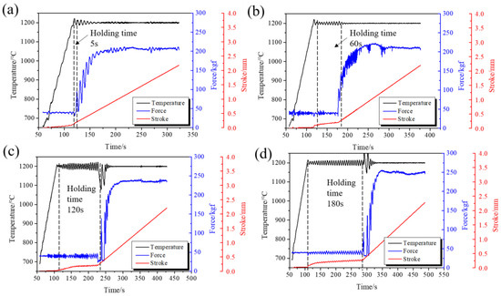 Extrusion force, temperature, and stroke displacement curves during the hot extrusion at different holding times. (a) 5 s; (b) 60 s; (c) 120 s; and (d) 180 s.
