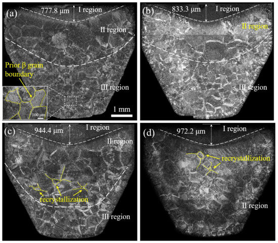 The holding time caused differences in the microstructure which affected the extrusion force further. In order to understand the influence of the microstructure characteristics on the extrusion force, Figure 6 shows the billet microstructure at the end of each holding time under a steady clamping force of 30 Kgf. Interestingly, the billet showed three different microstructures. The prior β grain sizes in the Ⅱ region were larger than that of the Ⅲ region when holding for 5 s, 60 s, and 120 s. By contrast, there were only two kinds of microstructures after holding for 180 s; the grain distribution in the Ⅱ region was uniform beside a few small-sized recrystallized β grains. These results can be attributed to the storage energy of the original billet with a high density of LAGBs (Figure 1) [29], which provided the driving force for recrystallization in the longer hold period (180 s). The recrystallized grains grew rapidly at a high temperature (1200 °C) and were accompanied by some small secondary recrystallized grains. In contrast, there was no recrystallization with holding times of 5 s or 60 s and there were a few initial recrystallized grains at 120 s. In each case, the lack of recrystallization was due to insufficient holding time. Moreover, the thickness of the Ι region increased with the extension of the holding time; the same was seen in the Ⅱ region for holding times from 5 s to 120 s.