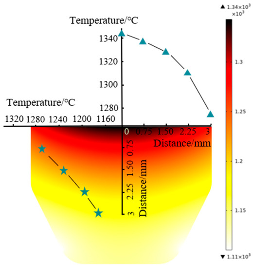 Figure 8 presents the billet’s temperature distribution at the end of the holding time. The temperature was generated by Joule heating. It was found that the temperature gradually decreased from the billet’s upper center to the sides. The billet exhibited a radial temperature gradient due to radiation from the outer graphite mold surface. At the billet’s upper surface, the center and edge temperature difference was 62 °C. Relevant literature [31] also revealed that the radial temperature gradient inside the TiN sample was 79 °C during the final dwell period at 1500 °C. Meanwhile, the longitudinal temperature gradient inside the billet was 230 °C higher than the radial temperature. The cause of the longitudinal temperature gradient has two aspects. On the one hand, due to the electrical current density, the billet’s upper surface was in contact with the graphite punch, while the lower end face was in a free state (Figure 2a). On the other hand, contact resistance between the billet’s upper surface and the graphite punch generated a large amount of Joule heat which transferred to the relatively low-temperature regions.