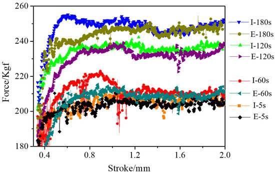 The extrusion force of different carburized layer thicknesses (I-5s, I-60s, I-120s, I-180s) and the extrusion force of carburized layers of the same thickness (E-5s, E-60s, E-120s, E-180s).