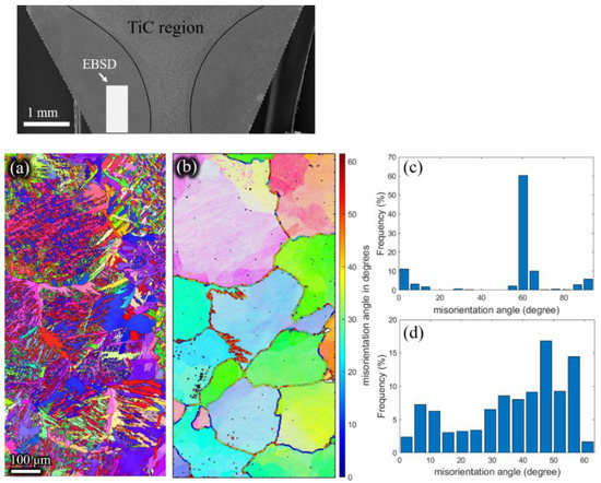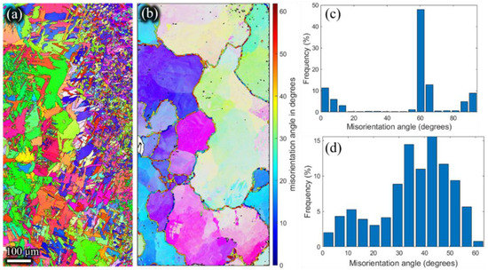 Inverse pole Figures of (a) the α phase, and (b) the reconstructed β phase. Misorientation angle of (c) α grains, and (d) reconstructed β grains of the residual deformed billet with a holding time of 60 s.