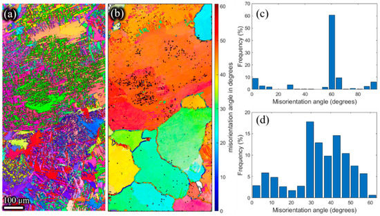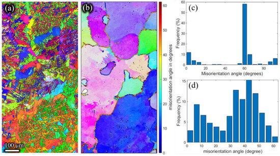 Meanwhile, as shown in Figure 11d, Figure 12d, Figure 13d and Figure 14d, the high angle grain boundaries (HAGBs) of the reconstructed β grains accounted for about 80% of the residual deformed billet. Such a boundary angle distribution suggests that recrystallization occurred during the plastic deformation [35] since the dislocation accumulation and rearrangement formed subgrains in the deformation process. With increasing strain, these subgrains trapped more dislocations in the LAGBs which finally transformed into HAGBs, and thus new continuous dynamic recrystallization (CDRX) grains formed [36]. It can be inferred that the CDRX was the controlling mechanism during the plastic deformation of the micro-gears. When the high-temperature β phase transformed into the low-temperature α phase, the misorientation of α laths (Figure 11c, Figure 12c, Figure 13c,Figure 14c) was mainly concentrated at ~2°, ~10°, ~60°, and ~90°. The peak of ~2° was the existence of subgrain boundaries. Theoretically, the transformation of the prior β phase to the α phase should follow the Burgers orientation relationship. Therefore, each parent β grain can be converted into 12 different orientation variants of α. However, the misorientations showed only five distinct misorientation angle pairs because of crystal symmetry: 10.5°<0001>, 60°<11-20>, 60.8°<−1.377; −1; 2.377; 0.359>, 63.3°<−10; 5; 5; −3>, 90°<1; −2.38; 1.38; 0> [31], unlike the random distribution between the 12 α variants.
