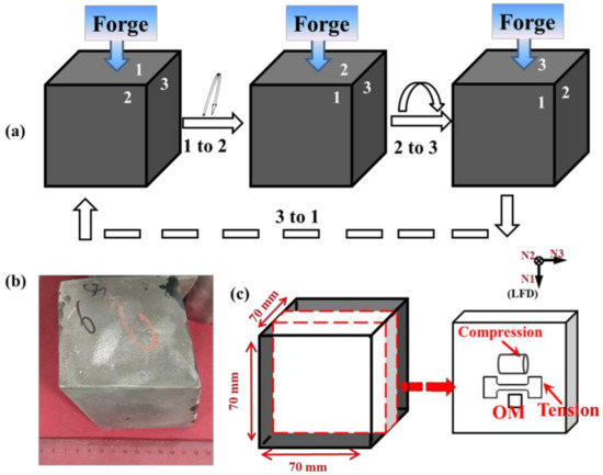 The material used in the present study was GW52 alloy ingot (Mg-4.96Gd-2.44Y-0.43Zr, mass fraction, %). The as-cast GW52 alloy ingot was homogenized at 480 °C for 8 h with subsequent cooling in air, and then it was cut into some cubic sample with dimensions of 70 × 70 × 70 mm3. These cubic samples were first heated to 480 °C in an electric resistance furnace and kept for 60 min. In addition, the heating rate is 15 °C/min. Then, the multidirectional impact forging (MDIF) was carried out using an industrial air pneumatic hammer machine (Shandong Chu Hang Heavy Industry Machinery Co., Ltd., Weifang, China) with a load gravity of 250 Kg. A pass strain ~0.05 was applied and the average strain rate was around 20 s−1. The procedure during the MDIF was shown in Figure 1a. One of the cubic samples was forged to 200 passes with an intermediate annealing treatment for ~10 min at 480 °C, and it was termed as MDIF100+100 sample (symbol + means an intermediate annealing treatment for ~10 min after the first 100 forging passes). The entire forging and annealing process finished in ~15 min. After carefully checking, the MDIF100+100 sample was free from any surface defects, as shown in its macro-morphology image Figure 1b.