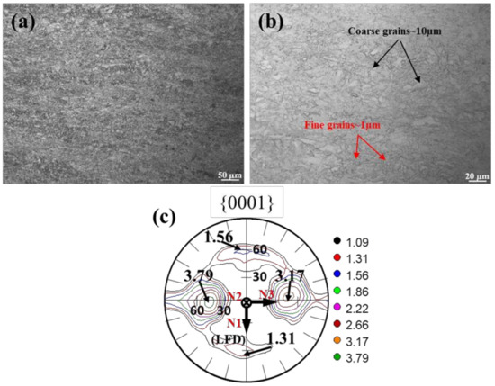 Figure 3 gives OM and corresponding {0001} macro texture of the MDIF100+100 sample of GW52 alloy. It can be observed a deformed microstructure in low magnification of OM in Figure 3a. High-magnification observation captured some coarse grains ~10 µm and a large number of small grains ~1 µm, as indicated by their respective arrows in Figure 3b. Besides, the corresponding {0001} macrotexture in Figure 3c illustrates a non-basal texture with many peaks (the intensity ≤ 3.79 multiples of random (mrd)).