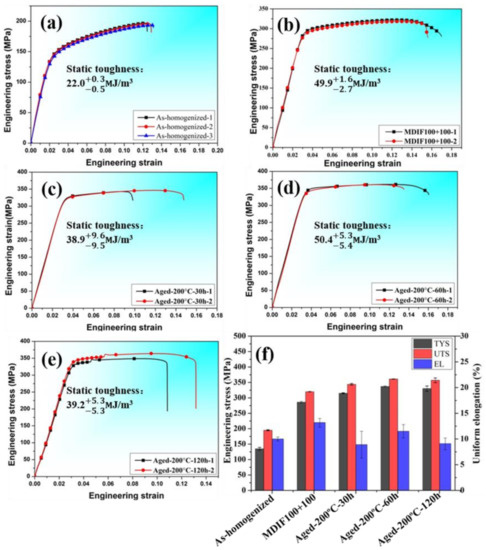 Room temperature tensile engineering stress-strain curves (a–e) and corresponding properties (f) of as-homogenized, MDIF100+100, and aged MDIF100+100 samples of GW52 alloy with their respective static toughness: (a) as-homogenized alloy, (b) MDIF100+100, (c) aged at 200 °C for 30 h, (d) aged at 200 °C for 60 h, (e) aged at 200 °C for 120 h.