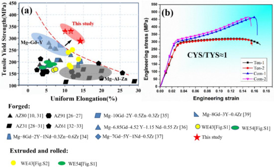 (a) Relationships between tensile yield strength and elongation of forged Mg-Al-Zn based and Mg-Gd-Y-based alloys as well as (b) tension-compression engineering stress-strain curves of MDIF100+100 sample of GW52 alloy.