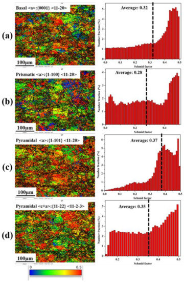 SF maps and corresponding distribution histograms for various slip systems of MDIF100+100 sample of GW52 alloy: (a) basal slip <a>:{0001} <11–20>, (b) prismatic slip <a>:{1–100} <11–20>, (c) pyramidal slip <a>:{1–101} <11–20>, (d) pyramidal slip <c+a>:{11–22} <11-2-3>.
