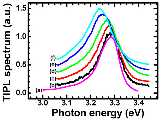 The TIPL spectra have been measured to assure that the optical fluences involved are weak enough to avoid the activation of the “p-line” (caused by exciton–exciton scattering), observable as a PL contribution peaking at 3.18 eV [34]. It is also possible to infer that the experimental conditions do not cause the dissociation of excitons due to the screening of the Coulomb potential by electron-hole plasma, which would lead to an emission peak at even lower photon energies [34,35], which are not observed here.