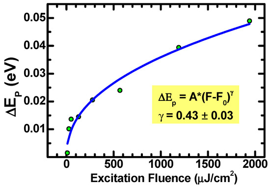 The PL spectra of Figure 1 exhibit a small energy shift toward lower energies, but retain the same spectral widths and shapes at increasing excitation fluences. These facts suggest that the excitons retain their individual character and binding energy at investigated fluencies, while the shift of the emission peak results from the bandgap narrowing. This is supported by the evidence shown in Figure 2, where the shift of emission peak energy is plotted vs. the excitation laser fluency, F. Notably, a power law provides a good fitting:
