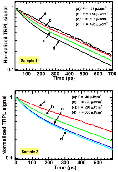 The analysis results are consistent with the predictions, as they give a lower value for , which is close to the fluence-independent slope (i.e., ) of the TRPL curves. On the other hand, increases at larger values of the laser fluence. The black curves represent the best fit of the data obtained through Equation (8) and using . The values for the quantities N, b and τ obtained from best fits are reported in Table 1.