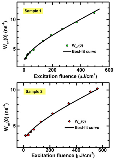 Instantaneous recombination rate calculated at t = 0 vs. excitation fluence. The black curves are the best fit of the data obtained by use of Equation (8).