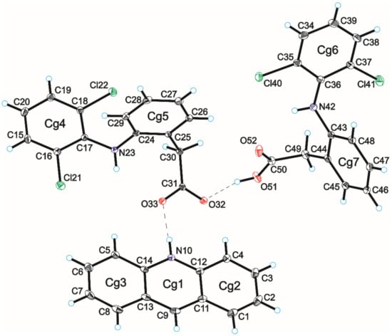 The single-crystal X-ray diffraction measurements show that compound 1 crystallizes in the triclinic P-1 space group with one acridinium cation, one diclofenac anion and one diclofenac molecule in the asymmetric unit (Figure 1).