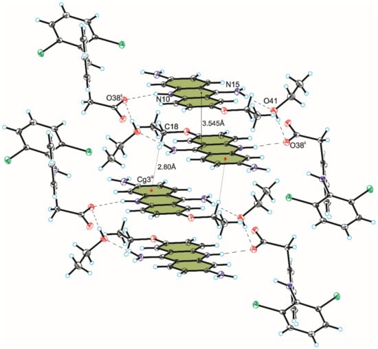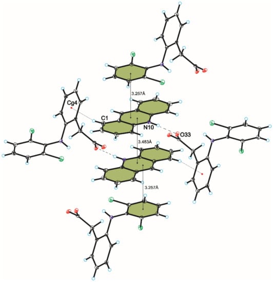One of the fields dealing with the design, preparation, and research of new forms of drugs is crystal engineering. Thanks to our understanding of the nature of intermolecular interactions, such as hydrogen bonds [28,29,30], halogen bonds [31,32,33], π–π stacking interactions [34,35,36], and others [37,38,39,40], it is possible to obtain APIs as multicomponent crystals such as salts, cocrystals, salt cocrystals, or their solvates [41,42,43]. From the pharmaceutical point of view, the most interesting are the multicomponent crystals containing more than one Active Pharmaceutical Ingredients (APIs), the physicochemical and pharmacological properties of which may be better than single APIs [44,45,46,47]. A search of the Cambridge Structure Database (CSD version 5.43, update November 2021) [48] shows that there are 76 crystal structures of organic compounds containing diclofenac, including 58 structures of salts, 13 structures of cocrystals and 5 structures of salt cocrystals. However, there are only a few examples showing the possibility of formation crystalline drug–drug system involving diclofenac and aromatic nitrogenous bases [49,50,51,52,53,54,55,56,57].