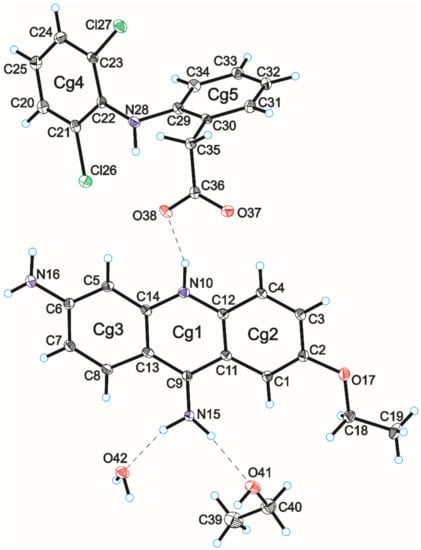 The single-crystal X-ray diffraction measurements show that compound 2 crystallizes in the triclinic P-1 space group with one 6,9-diamino-2-ethoxyacridinium cation, one diclofenac anion, one ethanol molecule and one water molecule in the asymmetric unit (Figure 4).