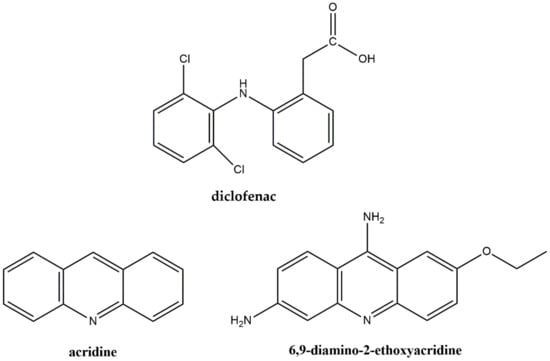 All the chemical compounds were purchased from Sigma-Aldrich (St. Louis, MO, USA) (acridine, 6,9-diamino-2-ethoxyacridine-DL-lactate monohydrate) and Tokyo Chemical Industry TCI (diclofenac) and used without purification. Melting points were determined on a Büchi M-565 (Flawil, Switzerland) capillary apparatus and were uncorrected.