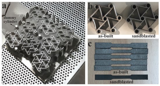 The surface finish is an important factor in the analysis of the mechanical performances of EBM printed parts, as EBM yields rougher surfaces than other AM processes. Polished specimens exhibit better strain at failure values for as-built parts thanks to the mitigation of surface irregularities that may cause crack initiations, and therefore stress concentration and premature failure [34]. Poor surface roughness and the presence of powder particles sintered on the surface may affect the stress calculation because of undesired variability and biases in cross-sectional area estimation. In this study, all samples were sandblasted with a fixed sandblasting cycle duration of 5 s for each surface. Surface roughness measurements were performed before and after the sandblasting operation. Figure 3 shows the samples in the pre-sintered bulk of powder at the end of the EBM process (Figure 3a); the as-built and sandblasted chiral unit components (Figure 3b); and the as-built and sandblasted tensile specimens that were already included in the same build (Figure 3c). In addition, a Hitachi Tabletop Microscope TM3000 was used to measure the effective cross-sectional areas after tensile specimens were cut from the gauge region and polished using a mechanical polisher with 1200 grit sandpaper.