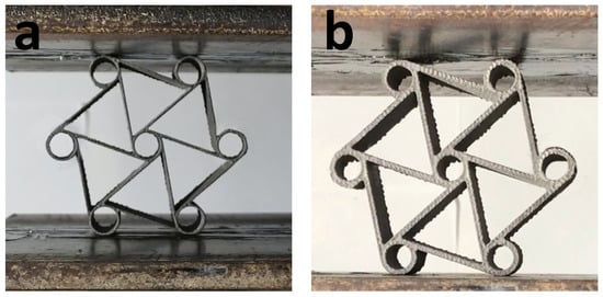 In this study, an ARCAM A2 system was used for the additive production of tensile, bending and chiral unit specimens. Sixteen chiral unit samples were produced in the same build by using gas atomized Ti6Al4V ELI (extra low interstitial) powder with an average size of 45–106 m. Table 2 shows the powder’s chemical composition. The mechanical specifications indicated by the machine vendor for this material are listed as Young’s modulus, yield stress, ultimate tensile strength and elongation equal to 120 GPa, 930 MPa, 970 MPa and 16%, respectively [33]. The samples were produced on two different levels along the z-axis, as shown in Figure 2. By exploiting the pre-sintered nature of the powder, caused by the high-temperature pre-heating phase, “floating supports” were used for samples in the upper z level, as shown in Figure 2b. Dummy cylinders were included in the build to enhance the homogeneity of the thermal load within the entire build volume, as exhibited in Figure 3a. Four groups of tensile and bending specimens, including five specimens in each group, were produced. Groups can be defined as 0.8 mm thick vertical and horizontal, and 1.6 mm thick vertical and horizontal builds. The samples were produced with a layer thickness of 50 m while applying default process parameters provided by the machine vendor for this powder.