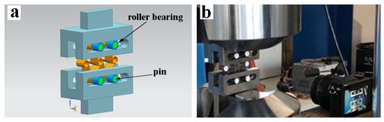 In all tests, MTS 810 Material Test System (MTS Systems Corporation, Eden Prairie, MN, USA) was used with MTS 647 Hydraulic Wedge Grip (MTS Systems Corporation, Eden Prairie, MN, USA), and MTS 634.31F-24 (MTS Systems Corporation, Eden Prairie, MN, USA) extensometer was utilized in the tensile tests. As for the crush tests, two rigid plates were used to compress chiral units and lubricant applied to the surface of rigid plates to enable the free movement of the chiral elements, as seen in Figure 5. In addition, for the chiral lattice cyclic compression tests, an additional specific fixture was designed to accomplish the tests, which consisted of two wide steel forks, with horizontal grooves. Pins were inserted in the four lower and upper nodes of the chiral element, and roller bearings were attached to the pins to allow them to slide in the grooves. The design and illustration of fixture and the test layout are shown in Figure 6a. Therefore, the two upper and lower nodes of chiral elements were allowed to move laterally and to rotate while the unit was compressed, as seen in Figure 6a. The test velocity was defined as 1 mm/min. Transverse strains were measured to calculate Poisson’s ratio. For measurement of transverse deformation, all tests were recorded with a high definition camera as seen in Figure 6b, and speckled papers were placed on the nodes to track their movements in the cyclic tests.
