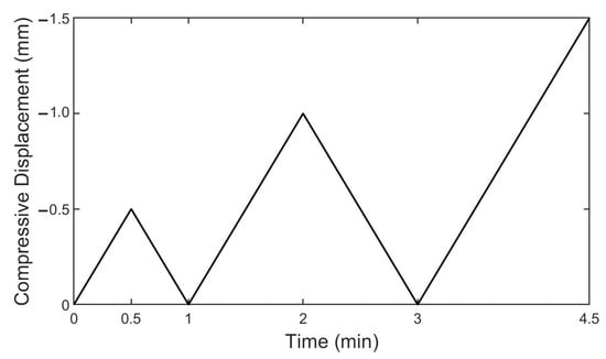 The chiral elements produced with different thicknesses of 0.8 and 1.6 mm were tested with a compressive load profile to investigate their elastic limits by applying large displacements without experiencing permanent deformations, degradation or failures. The compressive load profile is depicted in Figure 7. The test first started with compression to a limit of 0.5 mm displacement, and thereafter a displacement controlled tensile phase was commenced and continued in which the load reached zero, and then compression started again and proceeded until the defined displacement limit.
