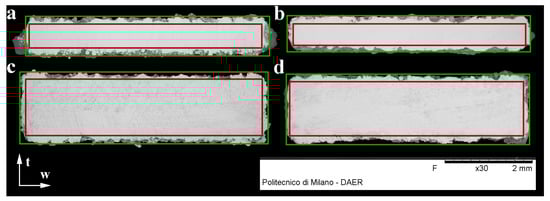 The green and red rectangular areas show the measured area and effective area, respectively, as seen in Figure 8. The area between red and green area can be considered as mechanically inefficient area, owing to the irregular distribution of this material along the specimen axis. We found that the inefficient area in the thickness (t) direction does not vary according to the thickness of produced parts. For as-built parts, the inefficient area thickness was 0.175 mm, and it was 0.165 mm for sandblasted parts. Furthermore, the inefficient area thickness in the width direction shows a similar pattern, and it was 0.130 or 0.120 mm for as-built and sandblasted parts, respectively. As a result, the effective area (Ae) can be calculated according to Equation (3) for sandblasted parts.