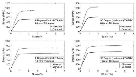 The tensile test was elaborated to obtain the stress vs. strain curves, considering both the measured and the corrected areas. Results are presented in Figure 9 for 0.8 mm thick and 1.6 mm thick specimens with the vertical and horizontal direction of production. Corrected results indicate the stress values that are calculated by the corrected area using Equation (3) instead of the measured area with a caliper.