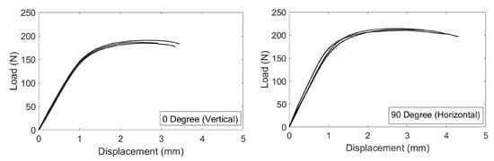 Load-deflection curves for 0 and 90 build orientation specimens in the bending test.