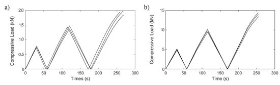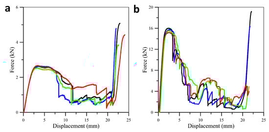 Compressive load and deflection graphs of chiral units with a ligament thickness of (a) 0.8 mm, (b) 1.6 mm.