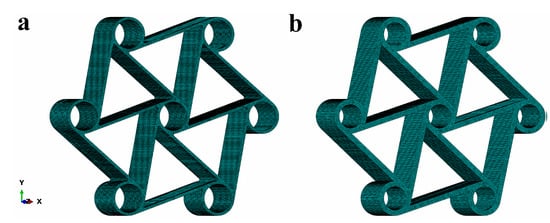 For numerical analysis of the three steps, cyclic compression of C1 and C2, implicit finite element models were developed by using the Simulia/Abaqus Standard finite element code. In the analyses, quadratic brick elements (C3D20R) having a reduced integration scheme were used. During the meshing process, a relatively irregular mesh was obtained due to the complex shape of the chiral structures. The maximum deviation factor was kept under the value of 0.1 and the maximum aspect ratio was defined as 3. The selection of appropriate element types aimed to provide better accuracy in the validation by maintaining lower computational costs. Thus, quadratic elements were selected and convergence studies have been conducted. As a result, approximately 193,154 continuum elements for C1 and 214,360 for C2 were created, having typical sizes of 0.3 and 0.4 mm for C1 and C2, respectively. The finite element models of the two chiral C1 and C2 elements are presented in Figure 13.
