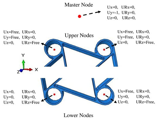 Distributing couplings were used to constrain the motion of coupling nodes over the rotation and translation of the reference node, and this link enabled the control of transmitted loads using weight factors at the coupling nodes [40]. For the distributing couplings, reference nodes were created in the middle of the cylindrical chiral nodes, and the nodal degrees of freedom of the elements belonging to the inner surface of the chiral nodes were linked to the motion of such reference nodes. In particular, the nodes of the inner surfaces were forced to rotate according to the rotation of the reference node, but the surface could deform radially. These reference nodes are shown in Figure 14. The boundary conditions applied to the upper nodes made possible rotation about the pin axes (z-axis) so that the reference node and the linked surface of the chiral node were free to rotate; transverse motion was available in x-direction and the vertical motion in the y-direction. For the lower ones, rotation about pin axes was free, but vertical translation was set to zero and the horizontal translation of one of the nodes was fixed, to make a statically determinate, constrained system. The vertical compression was applied by connecting the vertical translation of the two upper nodes to the one of an additional master reference node, which was moved downward, as indicated in Figure 14. Moreover, a subroutine was implemented to define the load and displacement control at the same time for the compressive load profile. Whenever compression is applied to the chiral elements, some elements undergo plastic deformation even under small displacements. This situation caused a tensile load while reference nodes were trying to move the initial coordinates.
