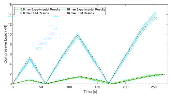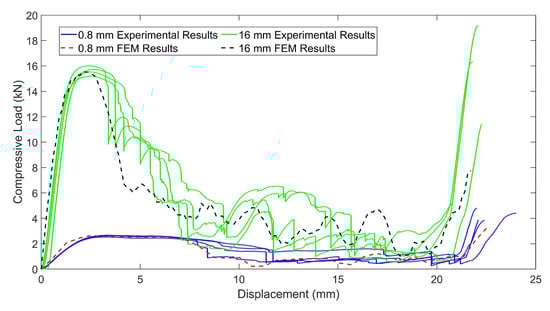 Compressive load profiles: experimental and FEM results for chiral elements of (a) 0.8 mm thickness, (b) 1.6 mm thickness.