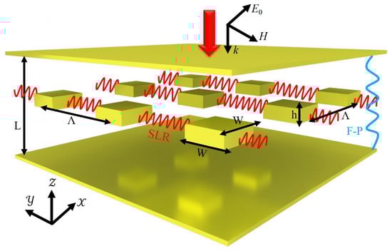Figure 1 illustrates the proposed plasmonic-photonic coupling system composed of an F-P microcavity formed by two thin gold films, and a two-dimensional infinite periodic array of gold nanorods embedded in the F-P microcavity. The gold films have thickness of 20 nm and are separated by distance L. The gold nanorods have thickness h, period in both x and y directions, and square-shaped cross section with side length W. The F-P cavity is filled by silica with the refractive index of , and the substrate and superstate are also taken to be silica. Unless otherwise specified, the gold nanorods have a square cross section with side length nm, thickness nm, and periods nm in both x and y directions. The plasmonic–photonic coupling system is normally illuminated by plane wave polarized along the x direction.
