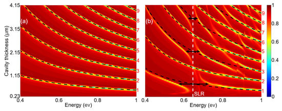Simulated reflectance spectra of (a) the unperturbed F-P cavity and (b) the proposed structure formed by periodic metal nanorods placed in the middle of the microcavity with different cavity lengths. The F-P resonances are indicated by black dashed curves in (a,b), and the SLR wavelength is indicated by the vertical white dashed line in (b).