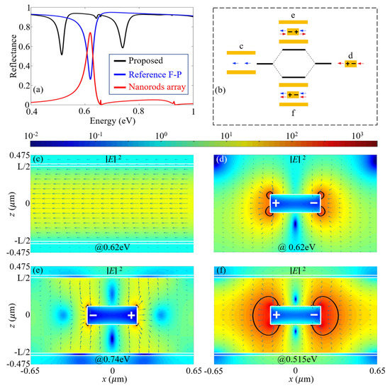 (a) Simulated reflectance spectra of the proposed plasmonic–photonic system (black curve), the reference F-P cavity (blue curve) and the nanorods array (red curve). The calculations were performed with nm. (b) Schematic illustration of the strong coupling of the first-order F-P resonance and the SLR into a bonding and an antibonding mode. The arrows indicate the directions of the near-field electric fields. (c–f) Simulated electric field distributions (color for intensity and arrows for directions) in the unit cell of (c) the reference first-order F-P resonance, (d) of the SLR of the nanorods array at 0.62 eV, and (e,f) of the split modes of the proposed structure that are resonant at (e) 0.74 eV and (f) 0.515 eV. The nanorods array and the thin metal films are outlined by white lines. “+” and “−” in (d–f) indicate charge distributions. The black curves in (d–f) show contours for electric field intensity enhancement of 100.