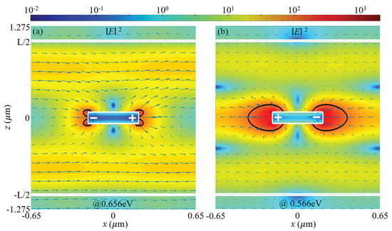 Similar to Figure 3e,f but for the split modes due to the strong coupling between the SLR and the third-order F-P resonance. These modes are resonant at (a) 0.656 eV and (b) 0.566 eV. The calculations were performed with nm.