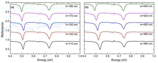 Simulated reflectance spectra of the proposed plasmonic-photonic system with different (a) nanorod heights h and (b) side widths w.