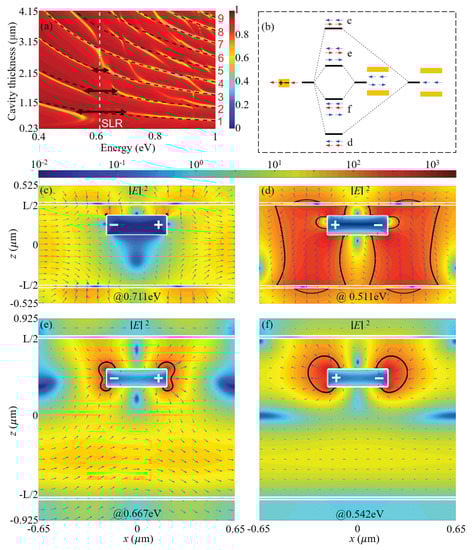 We now discuss the effects of the vertical position of the periodic nanorods. As an example, we position of the gold nanorods in such a way that the ratio of the distances to the two gold cavity mirrors are 1:3. Figure 6a shows that the SLR can strongly couple with the F-P resonances of both odd and even orders. This behavior is distinct from that of the strong coupling between the F-P resonance and the localized plasmons [,]. As the F-P resonance order increases, the splitting energy decreases in general. For the first- and second-order F-P resonances with nm and nm, the splitting energies are 200 meV and 125 meV, which are 32% and 20% of the resonant energy, respectively. These results confirm the strong coupling regime. The corresponding electric fields of the split modes due to the strong coupling are shown in Figure 6c–f, respectively. Similar to the above results shown in Figure 3e,f and Figure 4, the antibonding modes that are resonant at high energies have suppressed fields around the metal nanorod, whereas the bonding modes that are resonant at low energies have significantly enhanced electric fields over large volumes; the extended near fields around the gold nanorods are restricted to one cavity mode defined by the two node planes of the standing wave in the F-P cavity. The bonding and antibonding characteristics of the split modes in Figure 6c–f are illustrated in Figure 6b.