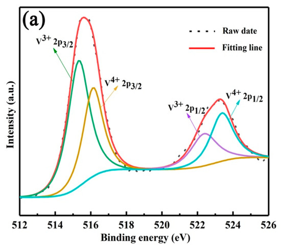 In order to clarify the extraction mechanism, the occurrence states of vanadium, chromium, iron and aluminum ions in the extract were studied. Firstly, the valence states of vanadium and chromium ions were analyzed by XPS, as shown in Figure 8a, the binding energy peaks at 515.29 and 522.61 eV were attributed to V3+ 2p3/2 and V3+ 2p1/2, and the binding energy peaks at 516.2 and 523.4 eV were assigned to V4+ 2p3/2 and V4+ 2p1/2. Therefore, the vanadium ions in the extract are composed of V3+ and V4+ [19]. The XPS results of chromium ions are shown in Figure 8b, the binding energies of 577.1 and 586.5 eV belonged to 2p3/2 and 2p1/2 of Cr3+, and the binding energies of 579.2 and 588.5 eV belonged to 2p3/2 and 2p3/2 of Cr6+. Therefore, chromium ions in the extract mainly exist in the form of Cr3+ and a small amount of Cr6+ [18,20].