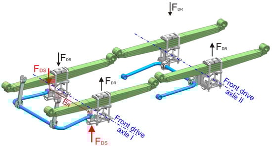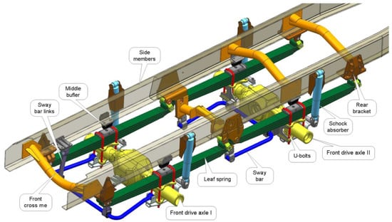 In the case of two- or three-axle cars, the load on the front axle leaf spring is mainly due to the vehicle dead weight, the overload resulting from the driving speed, and the height of the bumps [1,2,3,4]. On the other hand, in four-axle cars, in which the first two axles are based on springs, there is an additional load resulting from overcoming uneven terrain [5]. This suspension is particularly susceptible to operating under fatigue-limited conditions. The suspension system is usually unbalanced statically in these cars, and there is no load equalization between the first and second axles. Exceptions are the suspensions of some Mercedes, Oshkosh, and other car models.